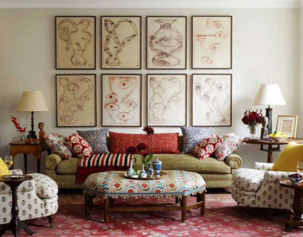 Bir duvar birbirini andıran sekiz resim ile simetrik bir şekilde dekore edilmiş. Rengarenk yastıklar ve bu yastıkların hizmetinde olan kanepe ise bu salon dekorasyonu için son derece önemli bir konumda karşılıyor bizleri. Her şey farklı bu salon dekorasyonu içerisinde. Kumaş seçimleri, berjerler, kanepe hatta orta sehpa bile farklı desenlerde ki kumaşların ortak uyumunu yaşatıyor. Bu farklılıkların uyumu oldukça beğenimizi kazandı bu salon dekorasyonu ile birlikte.