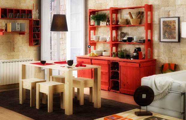 Nar çiçeği rengindeki görüntüsü ile son derece şık bir büfe ünitesi karşımızda. Yemek odası dekorasyonu için modern bir görüntünün hakim olduğu bu dekorasyon yine natürel ahşap ile tasarlanmış yemek odası masası ve sandalyeleri ile bir arada kullanılmış. Duvarda yer alan nar çiçeği renginde ki raflar ise modern temaya artı okunuşlar olarak sergileniyor.