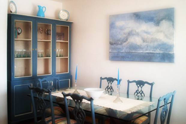 Mavi bir yemek odası dekorasyonu ile başbaşayız. Oymalı antika mavi sandalyeler aynı forma sahip mavi ahşap vitrin ile bir arada kullanılmış. Yemek masası olarak cam bir masanın tercih edilmesi ise dekorasyon için oldukça şık bir görüntü sunuyor. Cam ve ahşap güzel bir uyum yakalayarak bir araya gelmiş. Yemek masaları içinde cam tercih edilmesi hem mobilya uyumu açısından kolay bir tercihtir hem de diğer parçalar ile kolay kombinlenebilir.