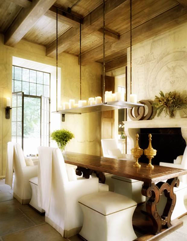 Eski Fransız filmlerine ait bir görüntü sanki! Şamdanların mumlukların asılı olduğu gösterişli bir masa üstü aydınlatması oldukça iyi işlenmiş bir ahşap masa ile bir arada kullanılmış. En sevdiğimiz görüntülerden biri olan beyaz renkli yemek masası sandalyeleri doğru bir seçim olmuş. Oldukça nostaljik bir görüntüye imza atılan bu dekorasyonda eskiye tutku ile bağlı olanlar mutlu bir nefes alacaktır.