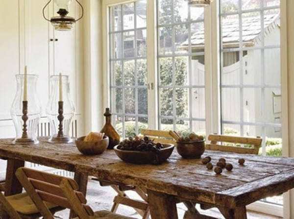 Bir başka yemek odası dekorasyonu için hasır ve kırmızı bir araya geliyor. Genellikle bahçe dekorasyon konseptleri içinde kullanılan hasır masa sandalye takımları bu sefer oldukça şık bir görüntü içinde yemek odası dekorasyonu için tercih edilmiş. Eskitilmiş bir masanın country tarzında yemek odasına yerleştirilmesi ise sıra dışı olan bu görüntüye aşık olmamızı sağlıyor. Yemek odası ve dekorasyon eski püskü bir masanın eşliğinde evde derin bir duygu yaratıyor.