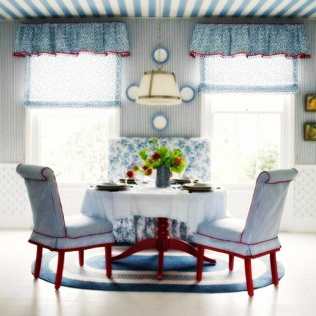 Yemek odası ve dekorasyon birleşiyor, leziz yemeklerin yenildiği bir alanda şen kahkahalar adeta dekorasyon ile birleşerek ortamı aydınlatıyor. Yemek odası ve dekorasyon yazımızda sizin için seçmiş olduğumuz mavi temalı bir yemek odası dekorasyonu gözümüze ilişiyor. Perdelerde ve sandalyelerde tercih edilmiş olan bu mavi renk yemek odası dekorasyonu için bir nefes olmuş. Aralara serpiştirilmiş hafif kırmızılar ise bu yemek odasını adeta canlandırmış.